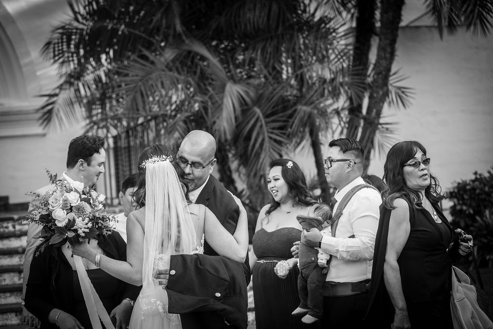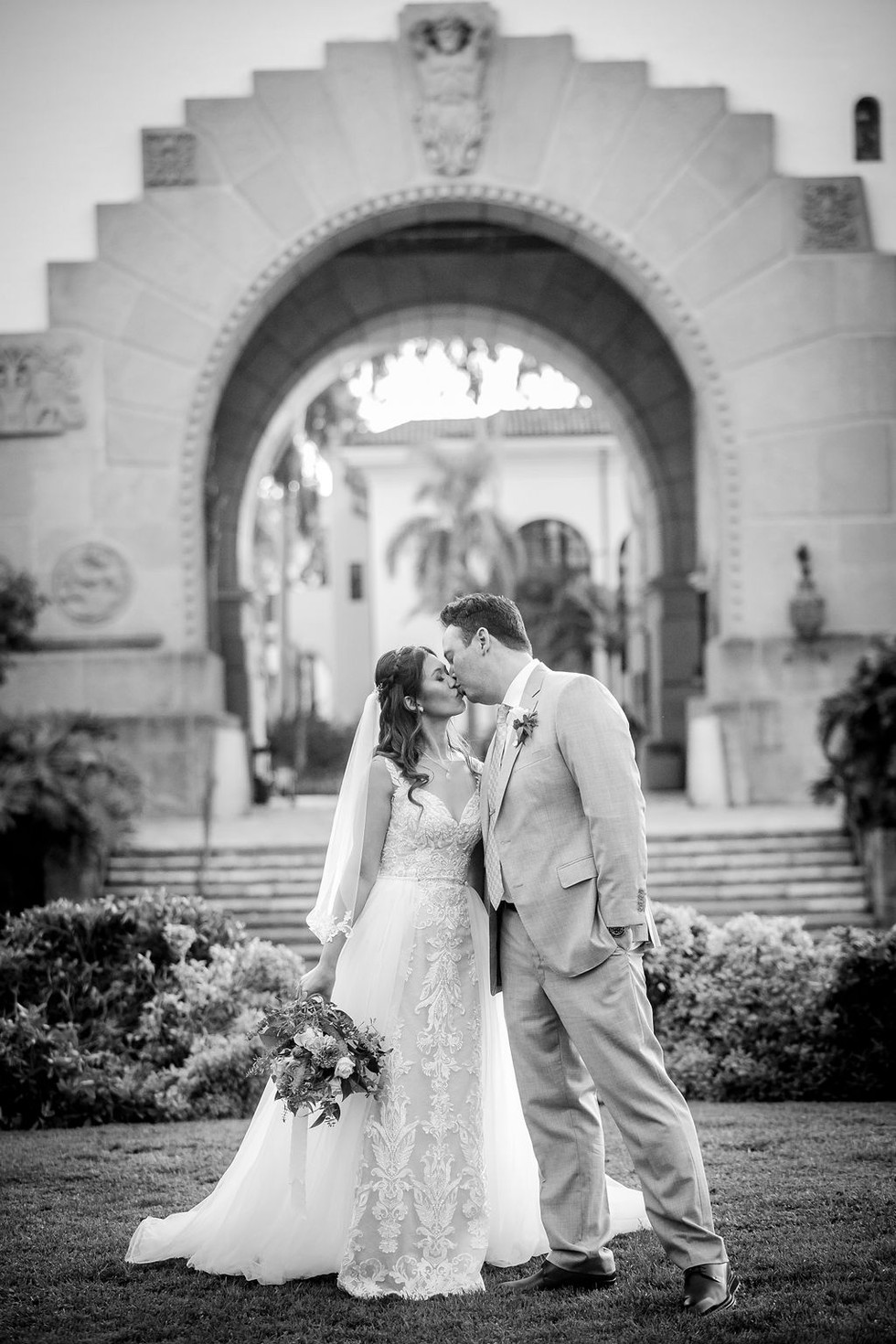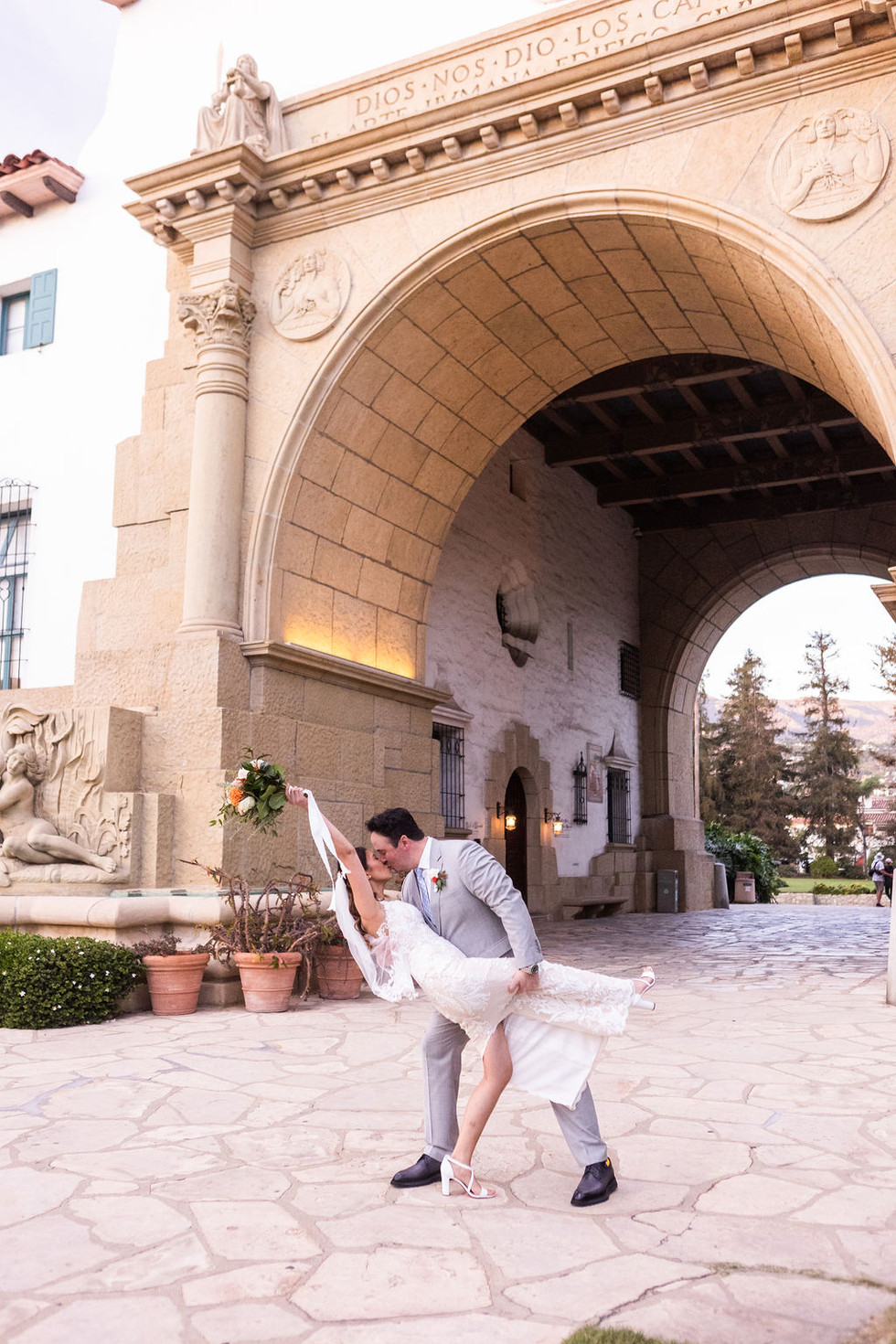 The Santa Barbara Courthouse has always been a very popular location for the wedding ceremony but it has been especially popular through the pandemic. There are many Santa Barbara Courthouse ceremony location options, but they chose to rent the "sunken gardens." It was the perfect place with a beautiful backdrop of the courthouse and stairs up high for their guests to see. Their guests stood at the bottom of the stairs and happily took photos of the two becoming husband and wife!